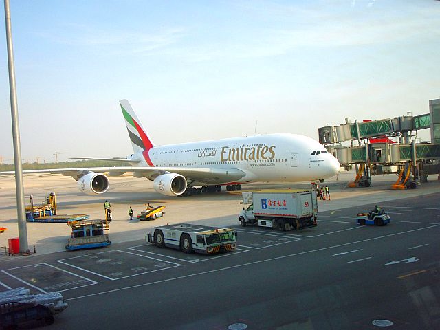 ターミナルを歩いていると、ちょうどエミレーツのエアバスA380が到着したところでした。